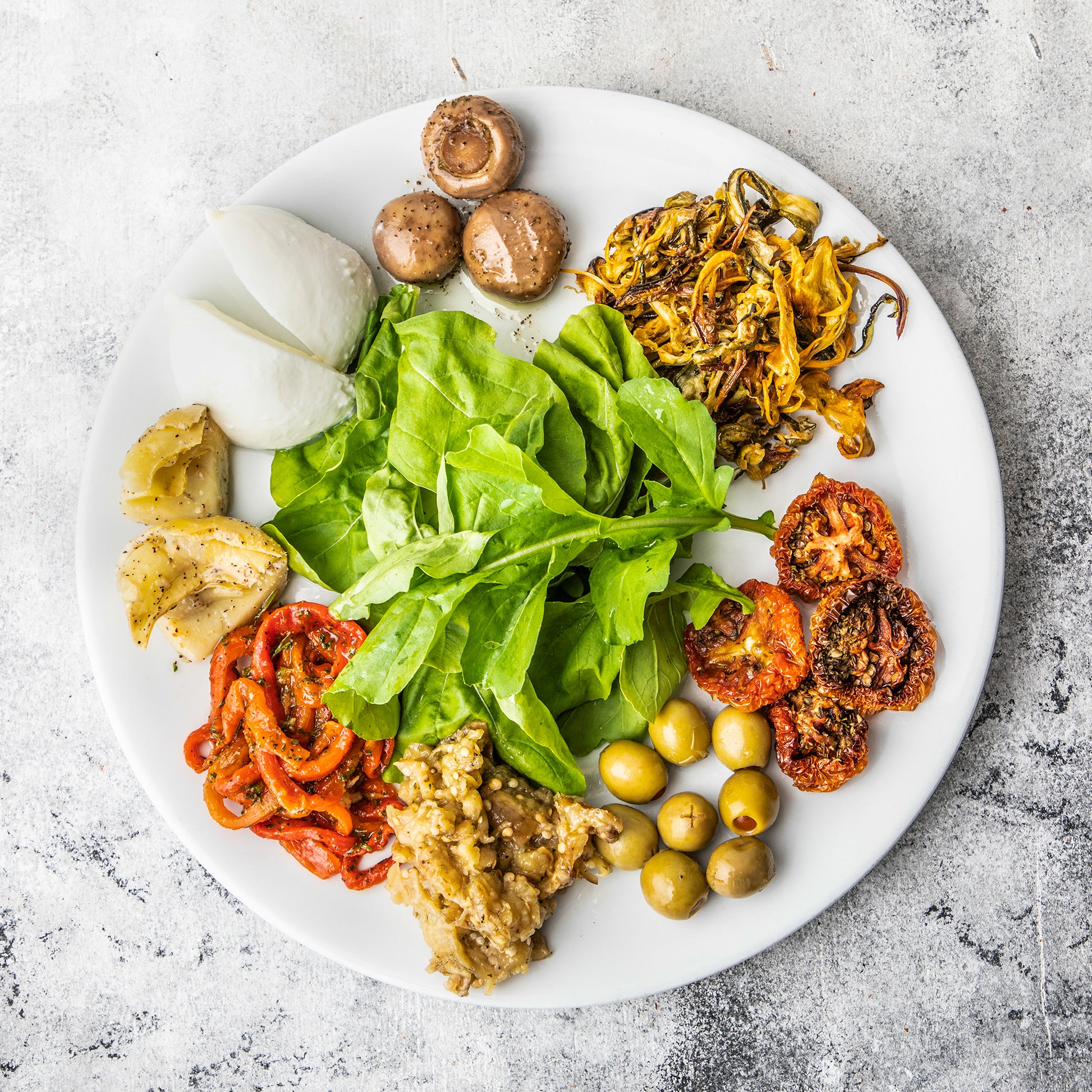 Pimentón, puré de berenjenas, tomate, zucchini, champiñones, aceitunas, rúgula y mozzarella.